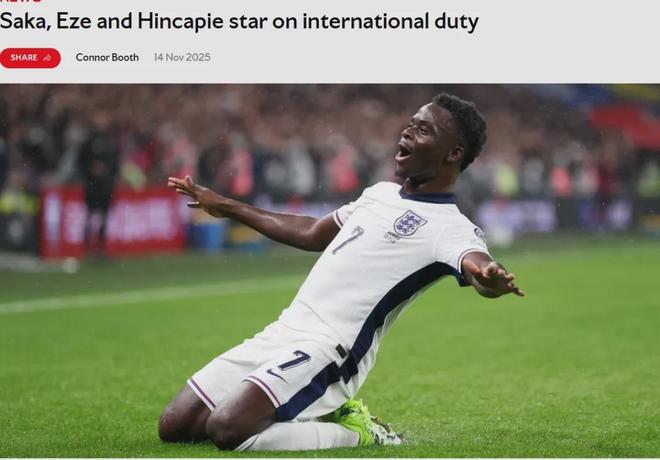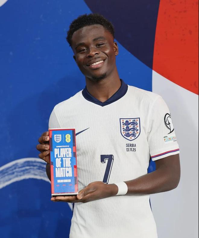 英格兰在世预赛2-0战胜塞尔维亚,萨卡打进首球并踢满全场,赛后他被评为了本场比赛最佳球员。