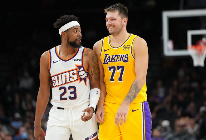由于今夏带领斯洛文尼亚男篮参加欧锦赛,东契奇连续缺席了三次季前赛,今日湖人客场对阵太阳,詹姆斯因坐骨神经痛继续休战,东契奇正式复出,与里夫斯、斯马特、艾顿和拉拉维亚一起首发出战。
