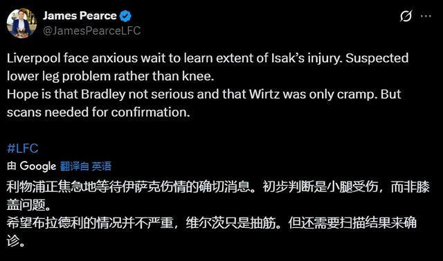 赛后,利物浦主帅斯洛特坦言“心里发毛”,只能焦急等待检查结果。而利物浦跟队记者James Pearce第一时间表示:“利物浦正焦急地等待伊萨克伤情的确切消息。初步判断是小腿受伤,而非膝盖问题。 希望布拉德利的情况并不严重,维尔茨只是抽筋。但还需要扫描结果来确诊。”