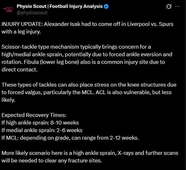 足球伤病分析博主Physio Scout认为,伊萨克的伤情更可能是高位踝关节扭伤,需要进行 X 光检查和进一步扫描以排除骨折可能性。